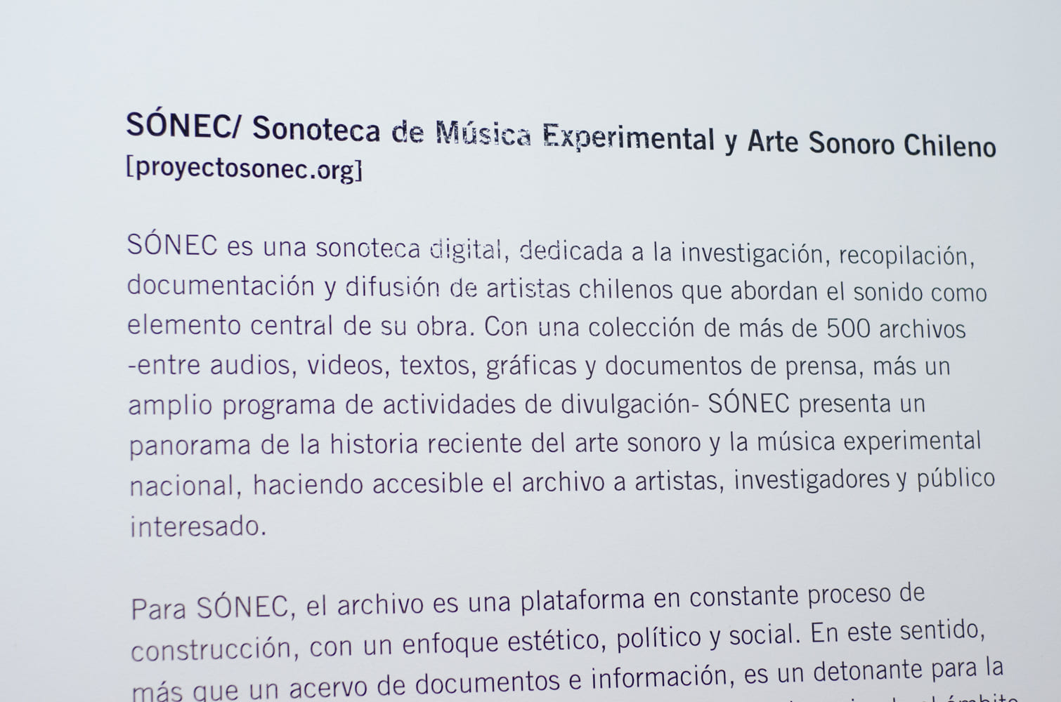 SÓNEC fue creado en 2014 en Valparaíso transformándose en la primera sonoteca online de música experimental y arte sonoro del país con más de 500 archivos disponibles en http://