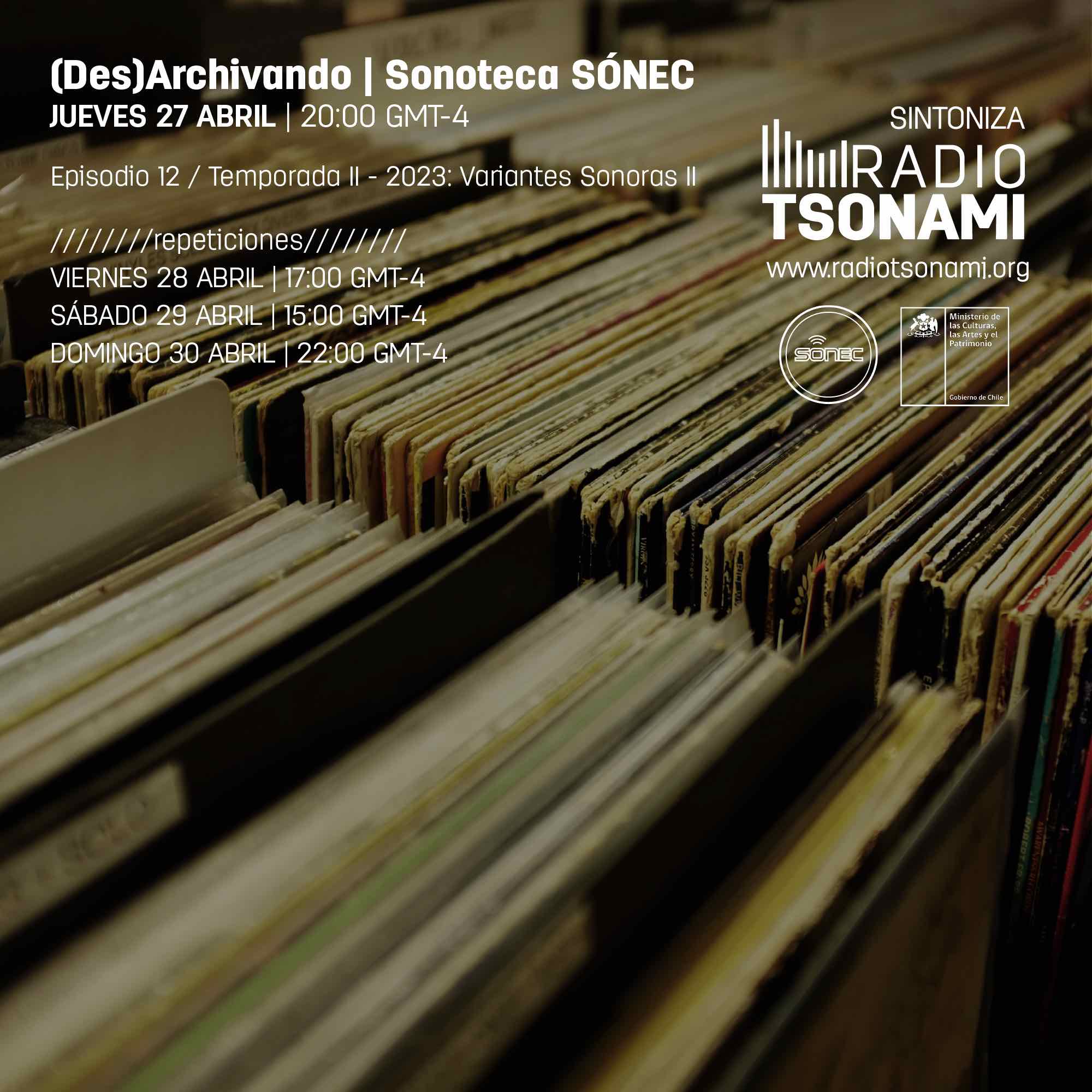 (Des)Archivando es el programa de radio de la Sonoteca SÓNEC, el cual busca escuchar y difundir obras sonoras, así como otros registros de trabajos albergados en el contenedor de archivos de la Sonoteca. Además, el programa plantea revisar y exponer la diversidad de propuestas estéticas, descubrir aportaciones de artistas y por sobre todo fomentar la valoración de la comunidad sonora/experimental chilena y de residentes.